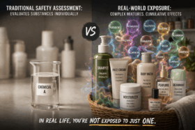 A common argument in the safety assessment of many chemical ingredients is that individual exposures occur at levels considered too low to produce biological effects. However, an important area of research has examined whether multiple low-dose exposures—across diet, household products, and personal care items—may combine to produce measurable hormonal activity.22,25 Some studies have demonstrated that mixtures of compounds with estrogenic properties can produce additive or even synergistic effects, even when each individual component is present at a low concentration.25