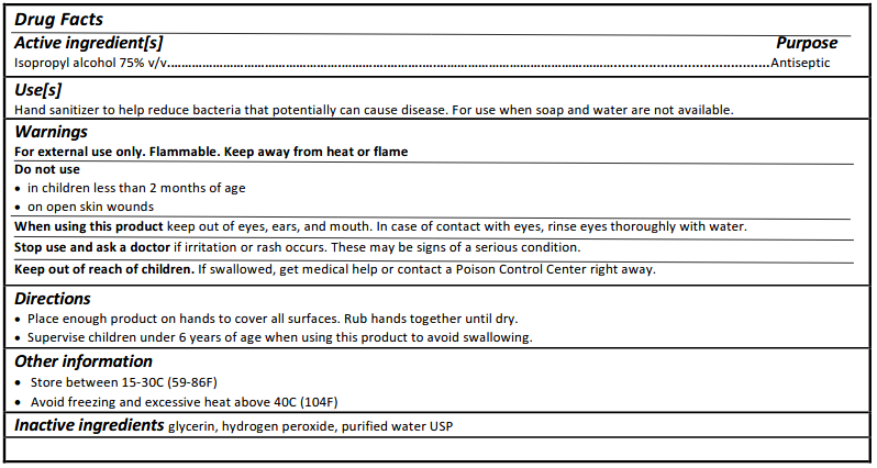 A typical formulation should be straightforward to recognize by turning the product over and reviewing the ingredients. It should clearly identify either ethyl alcohol or isopropyl alcohol as the active ingredient, along with components such as glycerin, hydrogen peroxide, and water. According to FDA labeling requirements, this information should appear in a standardized “Drug Facts” panel similar to the example shown below: